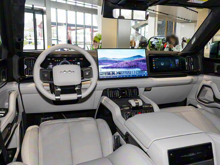 进入车内,内饰采用 “科技与硬派融合” 的设计理念,以三屏联动系统为核心 ——12.3 英寸全液晶仪表、17.3 英寸中控屏与 10.25 英寸副驾娱乐屏组成连贯的视觉体系,配合 64 色环境氛围灯,营造出兼具科技感与豪华感的座舱氛围。全液晶仪表支持越野、公路、导航三种显示模式,在越野模式下可实时显示车身倾角、海拔高度、四驱状态等专业数据,乘坐空间方面,2920mm 的轴距优势尽显,提供大五座与七座两种布局可选,满足不同家庭结构的需求。大五座版本的空间表现尤为出色,第二排腿部空间最大可达 870mm,身高 180cm 的乘客将座椅调至最后位置后,膝盖前方仍有超过两拳的空隙,配合可电动调节的腿托与靠背,能轻松实现半躺姿势,长途乘坐也不易疲劳。