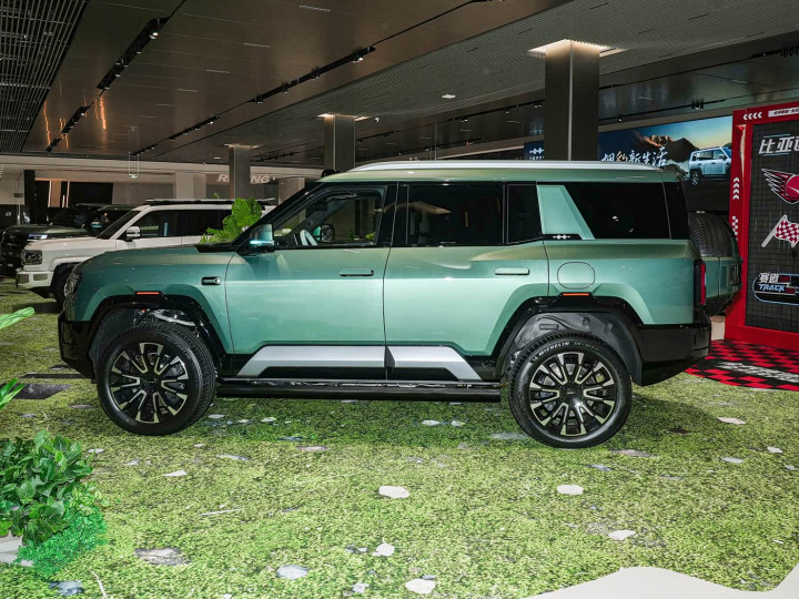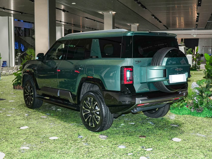 再来看车身侧面部分,平直的车顶线条从车头延伸至车尾,最大程度保障了车内头部空间,配合垂直的 D 柱设计,让车身在视觉上更显修长挺拔。车身侧面的黑色轮眉采用外扩设计,不仅强化了硬派气质,还为车轮提供了充足的转向空间,即便在极限越野时也能避免轮眉与轮胎的摩擦。全系标配的隐藏式门把手与电动侧踏提升了实用性 —— 门把手在解锁时自动弹出,降低风阻的同时增强科技感;电动侧踏在开门时自动伸出,离地高度仅 320mm,老人小孩上下车更加便捷,关门后自动收回,不影响越野通过性。新车以5195×1994×1875mm 的长宽高(选装行李架后高度 1905mm)与 2920mm 的轴距,在中大型 SUV 阵营中塑造出经典的方盒造型,将 “硬派气场” 与 “实用设计” 两个特质完美融合。