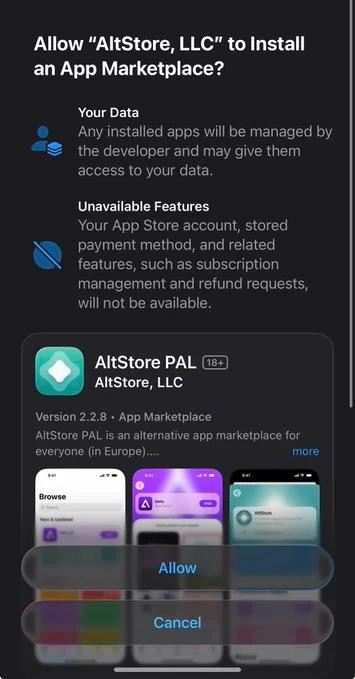 ●允许安装 AltStore PAL、Epic Games Store