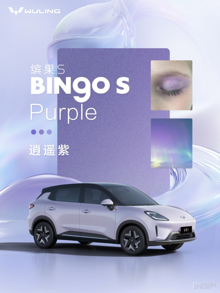 在配色方面,五菱缤果S配备四款车色,分别是松弛灰、逍遥紫、自在蓝和放空白,而且都是采用巴斯夫国际顶级车漆,搭配8层幻彩涂色工艺+2K清漆。