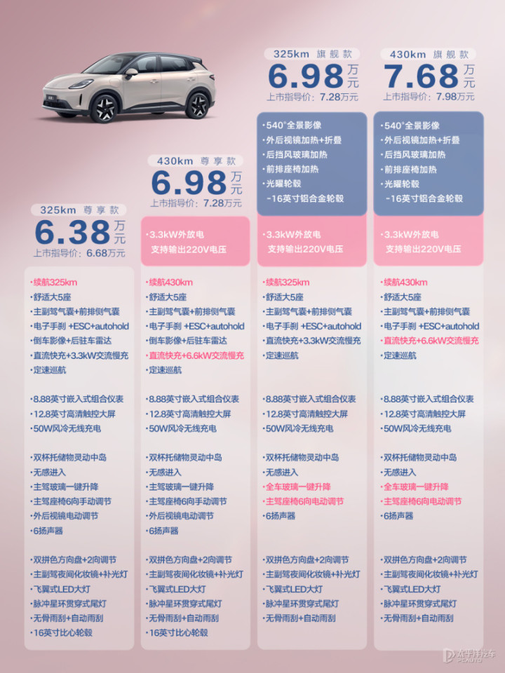新车作为缤果家族的第三款车型,它相比缤果质感更强。新车搭载最大功率75kW的驱动电机,可选CLTC续航里程325公里和430公里版本。