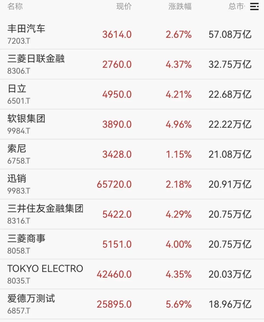 权重股方面,丰田汽车、三菱日联金融、日立、软银集团涨幅居前。