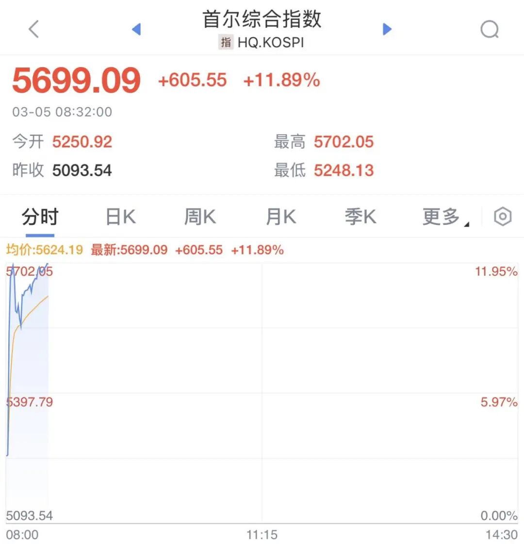3月5日,韩国市场开盘直线拉升,韩国KOSPI指数涨幅扩大至11%。因指数大涨,韩国交易所启动KOSDAQ指数熔断机制,程序化交易暂停5分钟。