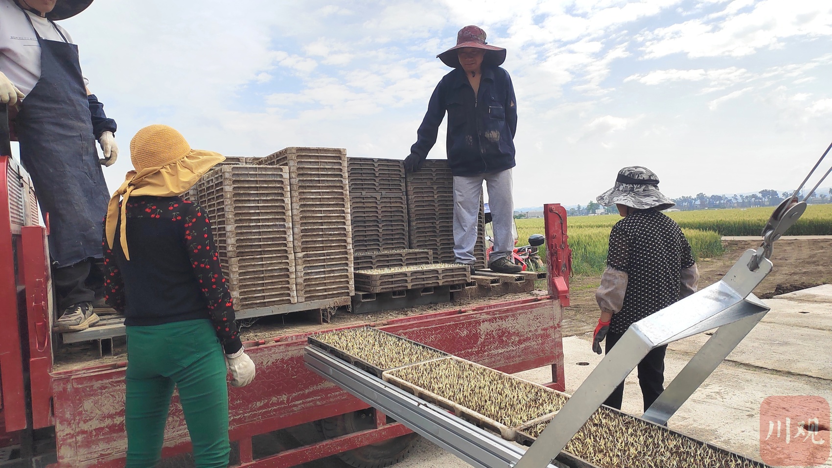 工人们正将秧盘摆放至传送带上。