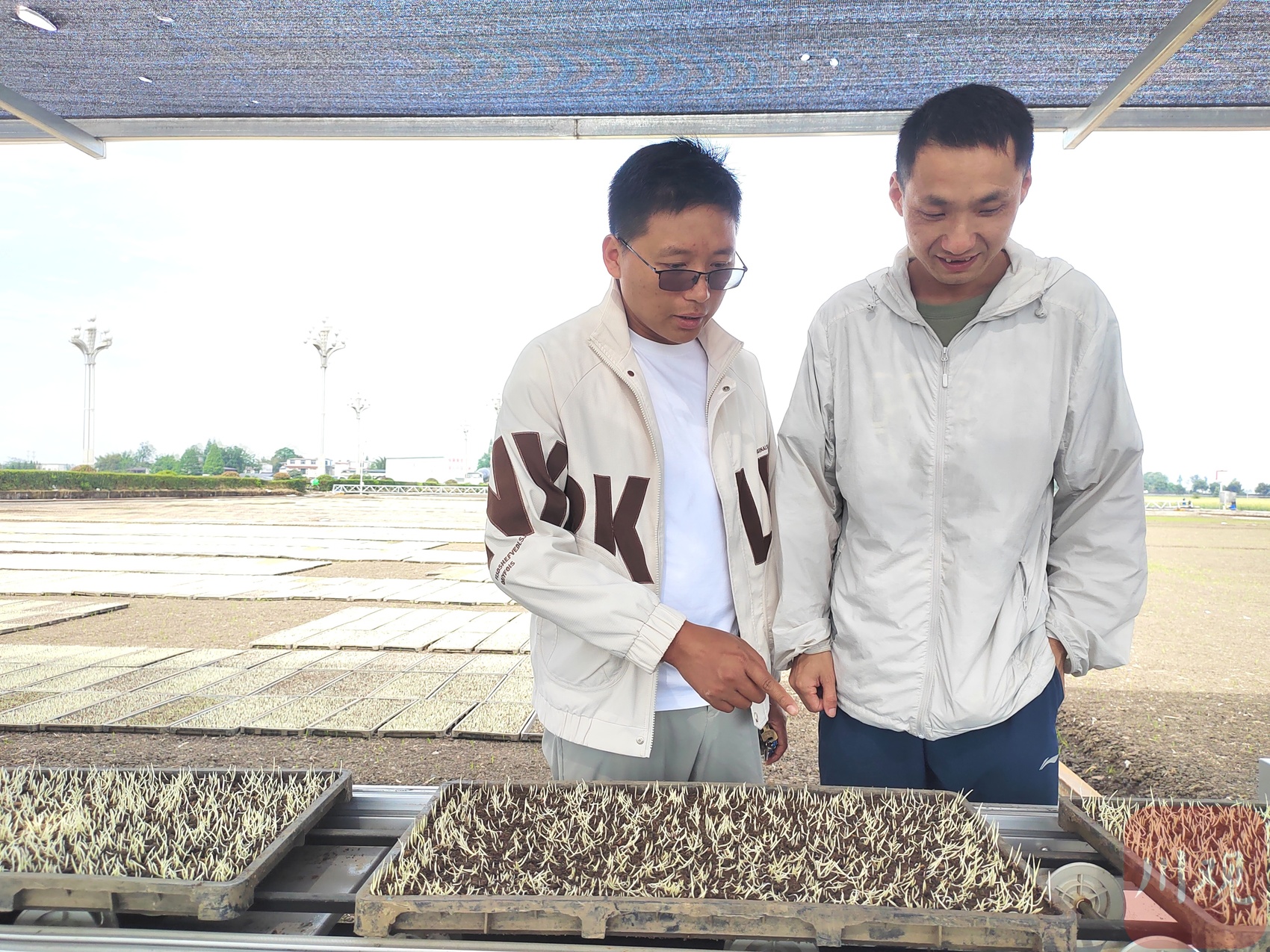 田里整齐地摆了不少秧盘。